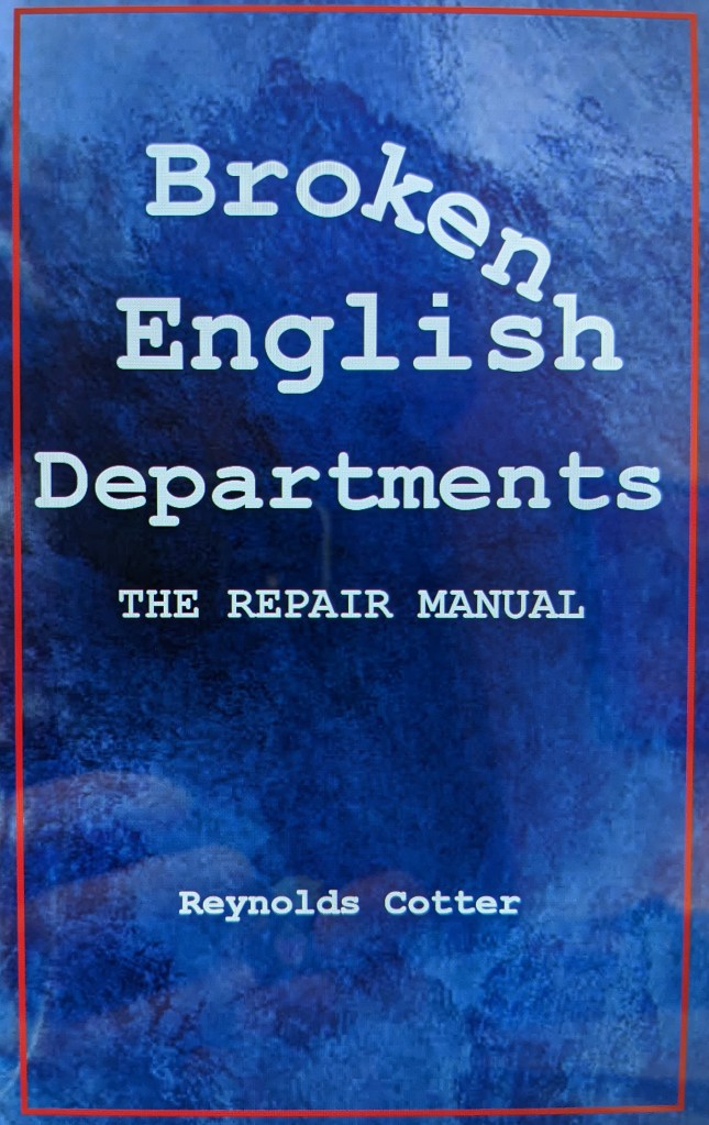 Reynolds Cotter, PhD, taught literature and writing courses for forty-five years as an English Professor. He served on countless committees and held various campus offices. He wrote BROKEN ENGLISH DEPARTMENTS: THE REPAIR MANUAL for alumni, parents, students, and taxpayers. “Reynolds Cotter” is the pseudonym of an actual professor.